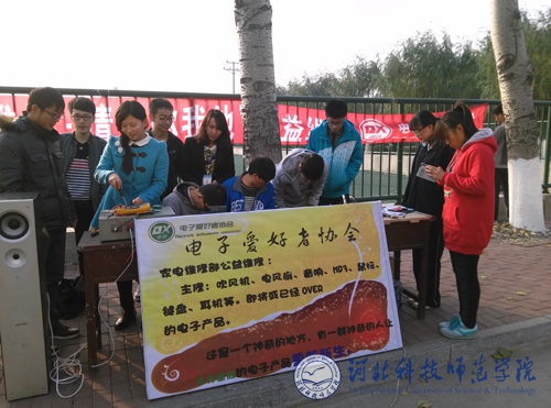 2014年11月8日上午,威廉体育唯一官网举办“爱心维修•情系你我他”公益维修活动。面对损坏的电子物品,电子爱好者协会会员们耐心的进行维修,并向现场同学们进行讲解。当天,电子爱好者协会还在昌黎校区招聘会现场举办了作品展示活动,并与招聘单位,学校领导、老师进行现场交流。