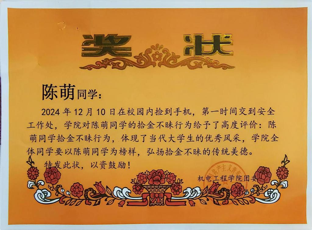 2024年12月10日,威廉体育唯一官网电气工程及其自动化专业2302班陈萌同学,在校园内捡到一部价值 3000元的手机,并第一时间交到安全工作处。当日安全工作处工作人员将手机归还了失主。