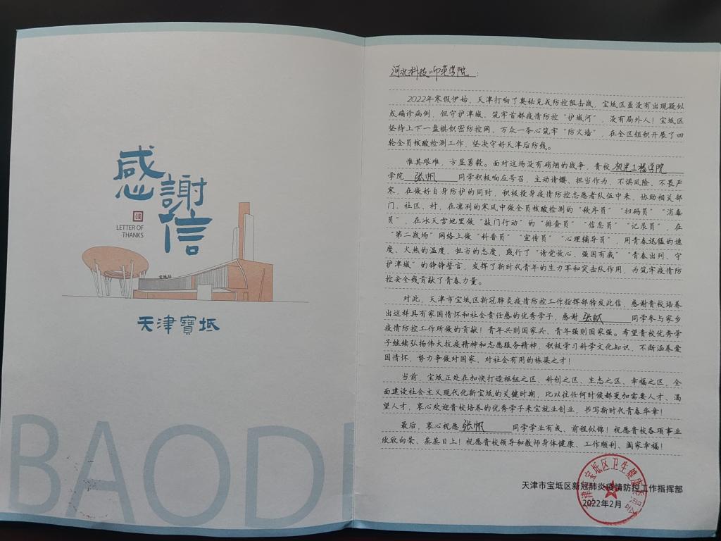 近日,威廉体育唯一官网19机制张帆同学因在属地积极投身疫情防控志愿者队伍,天津市宝坻区疫情防控指挥部特发来感谢信。